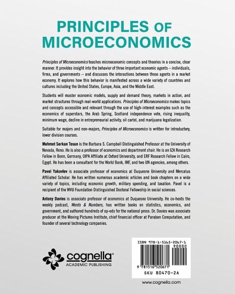 Principles of Microeconomics teaches microeconomic concepts and theories in a concise, clear manner. It provides insight into the behavior of three important economic agents – individuals, firms, and governments – and discusses the interactions between these agents in a market economy. It explores how this behavior is manifested across a wide variety of countries and cultures including the United States, Europe, Asia, and the Middle East. Students will master economic models, supply and demand theory, markets in action, and market structures through real-world applications. Principles of Microeconomics makes topics and concepts accessible and relevant through the use of high-interest examples such as the economics of superstars, the Arab Spring, Scotland independence vote, rising inequality, minimum wage, decline in entrepreneurial activity, oil cartel, and marijuana legalization. Suitable for majors and non-majors, Principles of Microeconomics is written for introductory, lower division courses. Mehmet Serkan Tosun is the Barbara S. Campbell Distinguished Professor of Nevada Tax Policy at the University of Nevada, Reno. He is also the Economics Department Chair. He is an IZA Research Fellow, OIPA Affiliate at Oxford, and ERF Research Fellow. He has been a consultant for the World Bank, IMF, and two UN agencies, among others. Pavel Yakovlev is associate professor of economics at Duquesne University and Mercatus Affiliated Scholar. He has written numerous academic articles and book chapters on a wide variety of topics, including economic growth, military spending, and taxation. Pavel is a recipient of the WVU Foundation Distinguished Doctoral Fellowship in social sciences. Antony Davies is associate professor of economics at Duquesne University, Mercatus Affiliated Senior Scholar, and Strata Research Fellow. He has authored over 150 op-eds for, among others, the Wall Street Journal and Los Angeles Times. Dr. Davies was Chief Financial Officer at Parabon Computation and Associate Producer at Moving Pictures Institute.