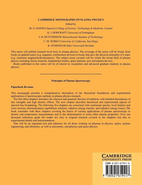 This monograph presents a comprehensive description of the theoretical foundations and experimental applications of spectroscopic methods in plasma physics research. The first three chapters introduce the classical and quantum theory of radiation, with detailed descriptions of line strengths and high density effects. The next chapter describes theoretical and experimental aspects of spectral line broadening. The following five chapters are concerned with continuous spectra, level kinetics and cross sections, thermodynamic equilibrium relations, radiative energy transfer, and radiative energy losses. The book concludes with three chapters covering the basics of various applications of plasma spectroscopy to density and temperature measurements and to the determination of some other plasma properties. Over one thousand references not only guide the reader to original research covered in the chapters, but also to experimental details and instrumentation. This will be an important text and reference for all those working on plasmas in physics, optics, nuclear engineering, and chemistry, as well as astronomy, astrophysics and space physics.
