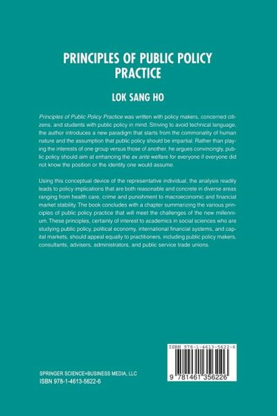 Using this conceptual device of the representative individual, the analysis readily leads to policy implications that are both reasonable and concrete in diverse areas ranging from health care, crime and punishment to macroeconomic and financial market stability. The book concludes with a chapter summarizing the various principles of public policy practice that will meet the challenges of the new millennium. These principles, certainly of interest to academics in social sciences who are studying public policy, political economy, international financial systems, and capital markets, should appeal equally to practitioners, including public policy makers, consultants, advisers, administrators, and public service trade unions.