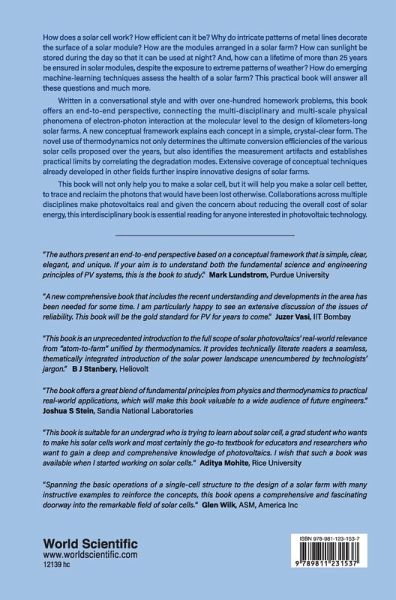 How does a solar cell work? How efficient can it be? Why do intricate patterns of metal lines decorate the surface of a solar module? How are the modules arranged in a solar farm? How can sunlight be stored during the day so that it can be used at night? And, how can a lifetime of more than 25 years be ensured in solar modules, despite the exposure to extreme patterns of weather? How do emerging machine-learning techniques assess the health of a solar farm? This practical book will answer all these questions and much more. Written in a conversational style and with over one-hundred homework problems, this book offers an end-to-end perspective, connecting the multi-disciplinary and multi-scale physical phenomena of electron-photon interaction at the molecular level to the design of kilometers-long solar farms. A new conceptual framework explains each concept in a simple, crystal-clear form. The novel use of thermodynamics not only determines the ultimate conversion efficiencies of the various solar cells proposed over the years, but also identifies the measurement artifacts and establishes practical limits by correlating the degradation modes. Extensive coverage of conceptual techniques already developed in other fields further inspire innovative designs of solar farms. This book will not only help you to make a solar cell, but it will help you make a solar cell better, to trace and reclaim the photons that would have been lost otherwise. Collaborations across multiple disciplines make photovoltaics real and given the concern about reducing the overall cost of solar energy, this interdisciplinary book is essential reading for anyone interested in photovoltaic technology.