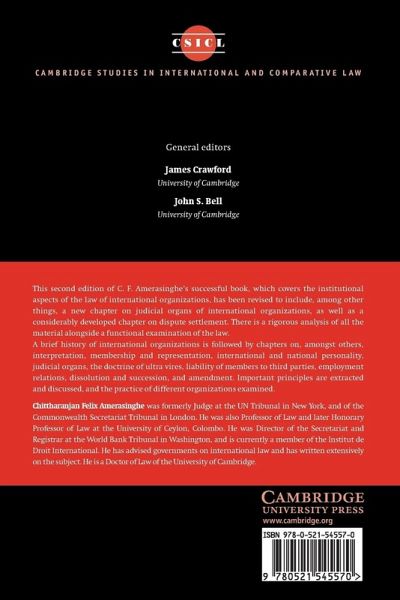 The second edition of C. F. Amerasinghe's successful book which covers the institutional aspects of the law of international organizations contains revisions to include a new chapter on judicial organs of international organizations as well as a considerably developed chapter on dispute settlement. There are also, among others, chapters on interpretation, legal personality, membership, the doctrine of ultra vires, liability of members to third parties, employment relations, and dissolution and succession. Important principles are deduced by rigorous analysis and the practice of different organizations is examined with functional considerations in mind.