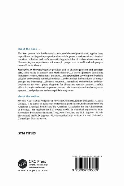Ideal for one- or two-semester courses that assume elementary knowledge of calculus, this text presents the fundamental concepts of thermodynamics and applies these to problems dealing with properties of materials, phase transformations, chemical reactions, solutions, and surfaces. The author utilizes principles of statistical mechanics to illustrate key concepts from a microscopic perspective, as well as to develop equations of kinetic theory. The book provides end-of-chapter questions and problem sets, some using MathCAD(TM) and Mathematica(TM); a useful glossary containing important symbols, definitions, and units; and appendices covering multivariable calculus and valuable numerical methods.