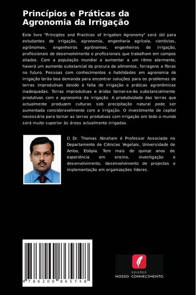 Este livro "Principles and Practices of Irrigation Agronomy" será útil para estudantes de irrigação, agronomia, engenharia agrícola, cientistas, agrônomos, engenheiros agrônomos, engenheiros de irrigação, profissionais de desenvolvimento e profissionais que trabalham em campos aliados. Com a população mundial a aumentar a um ritmo alarmante, haverá um aumento substancial da procura de alimentos, forragens e fibras no futuro. Pessoas com conhecimentos e habilidades em agronomia de irrigação terão boa demanda para encontrar soluções para os problemas de terras improdutivas devido à falta de irrigação e práticas agronômicas inadequadas. Terras improdutivas e áridas tornar-se-ão substancialmente produtivas com a agronomia da irrigação. A produtividade das terras que actualmente produzem culturas sob precipitação natural pode ser aumentada consideravelmente com a irrigação. O investimento de capital necessário para tornar as terras produtivas com irrigação em todo o mundo será muito superior às áreas actualmente irrigadas.