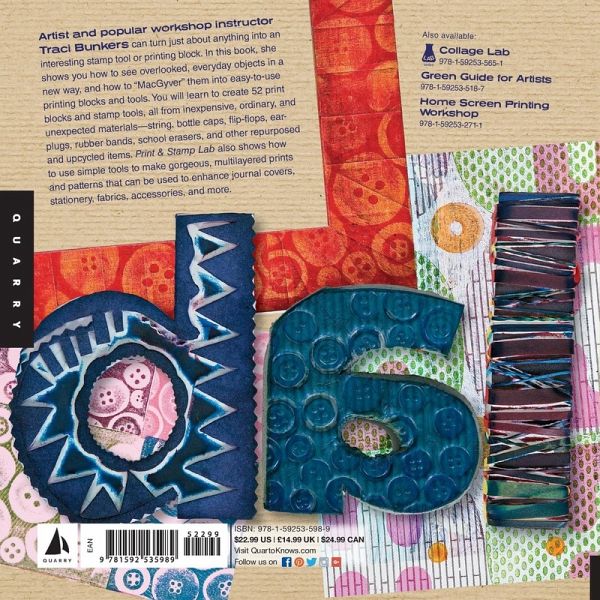 Artist and popular workshop instructor Traci Bunkers can turn just about anything into an interesting stamp, printing block, or tool. In this book, she shows readers how to see overlooked, everyday objects in a new way, and how to "MacGyver" them into easy to use printing blocks and tools. Readers learn to create 52 print blocks and stamp tools, all from inexpensive, ordinary, and unexpected materials--string, spools, bandaids, flip flops, ear plugs, rubber bands, school erasers, and a slew of other repurposed and upcycled items. The book also shows how to use those simple tools to make gorgeous, multi-layered prints and patterns that can be used to enhance journal covers, stationery, fabrics, accessories, and more.