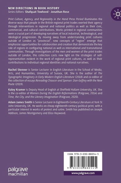 1. Introduction: Print Culture, Agency, Regionality.- Part I: Yorkshire.- 2. Printed by Alice Broade: The Career of York's First Female Printer, 1661-1680.- 3. Historiography, Regionality, and Print Trade Life Writing: The Case of Mr Thomas Gent, Printer, of York.- 4. The Newspaper, the Bookshop, and the Radical Society: Joseph Gales' Hartshead Press and the 'Reading and Thinking People of Sheffield'.- Part II: Circulation and Networks.- 5. Printing, Publishing, and Pocket Book Compiling: Ann Fisher's Hidden Labour in the Newcastle Book Trade.- 6. Elizabeth Davison and the Circulation of Chapbooks in Early Nineteenth-Century Northumberland.- Part III: Regions and Nations.- 7. 'The Privilege Granted to the Printer': The Role of James VI in the Scottish Print Trade 1567-1603.- 8. Print Agency and Civic Press Identity Across the Border: Commerce and Regional Improvement in the Glasgow Advertiser, Liverpool General Advertiser, and the Urban Directories of Liverpool and Glasgow,1765-1795.- Part IV: Technology.- 9. For Lack of Letters: Early Typographical Shibboleths of English and Other Foreign Languages.- 10. A New Type: Sans Serif Typography and Midlands Regional Identity.- 11. Afterword.