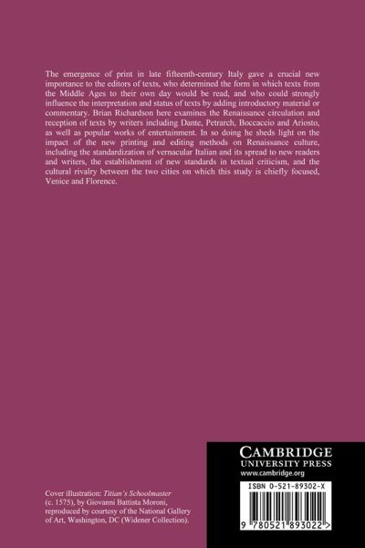 The emergence of print in late fifteenth-century Italy gave a crucial new importance to the editors of texts, who could strongly influence the interpretation and status of texts by determining the form and context in which they would be read. Brian Richardson examines the Renaissance production, circulation and reception of texts by earlier writers including Dante, Petrarch, Boccaccio and Ariosto, as well as popular contemporary works of entertainment. In so doing he sheds light on the impact of the new printing and editing methods on Renaissance culture.