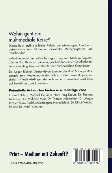 Haben Zeitung, Zeitschrift und Buch im elektronischen multimedialen Umfeld bald ausgedient? Antworten auf diese und andere Fragen gibt "Print-Medium mit Zukunft?" Von Konrad Delius bis Mark Wössner beziehen Experten namhafter Verlage Stellung.