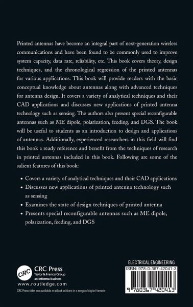 Printed antennas have become an integral part of next-generation wireless communications and have been found to be commonly used to improve system capacity, data rate, reliability, etc. This book covers theory, design techniques, and the chronological regression of the printed antennas for various applications. This book will provide readers with the basic conceptual knowledge about antennas along with advanced techniques for antenna design. It covers a variety of analytical techniques and their CAD applications and discusses new applications of printed antenna technology such as sensing. The authors also present special reconfigurable antennas such as ME dipole, polarization, feeding, and DGS. The book will be useful to students as an introduction to design and applications of antennas. Additionally, experienced researchers in this field will find this book a ready reference and benefit from the techniques of research in printed antennas included in this book. Following are some of the salient features of this book: Covers a variety of analytical techniques and their CAD applications Discusses new applications of printed antenna technology such as sensing Examines the state of design techniques of printed antenna Presents special reconfigurable antennas such as ME dipole, polarization, feeding, and DGS
