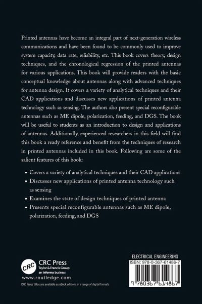 Printed antennas have become an integral part of next-generation wireless communications and have been found to be commonly used to improve system capacity, data rate, reliability, etc. This book covers theory, design techniques, and the chronological regression of the printed antennas for various applications. This book will provide readers with the basic conceptual knowledge about antennas along with advanced techniques for antenna design. It covers a variety of analytical techniques and their CAD applications and discusses new applications of printed antenna technology such as sensing. The authors also present special reconfigurable antennas such as ME dipole, polarization, feeding, and DGS. The book will be useful to students as an introduction to design and applications of antennas. Additionally, experienced researchers in this field will find this book a ready reference and benefit from the techniques of research in printed antennas included in this book. Following are some of the salient features of this book: