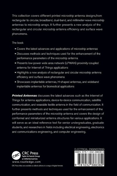 Printed Antennas discusses the latest advances such as the Internet of Things for antenna applications, device-to-device communication, satellite communication, and wearable textile antenna in the field of communication. It further presents methods and techniques used for the enhancement of the performance parameters of the microstrip antenna and covers the design of conformal and miniaturized antenna structures for various applications. It will serve as an ideal reference text for senior undergraduates, graduate students, and researchers in fields including electrical engineering, electronics and communications engineering, and computer engineering.