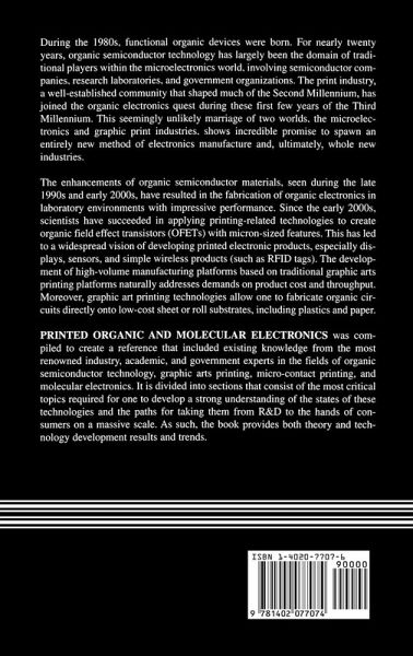 Printed Organic And Molecular Electronics was compiled to create a reference that included existing knowledge from the most renowned industry, academic, and government experts in the fields of organic semiconductor technology, graphic arts printing, micro-contact printing, and molecular electronics. It is divided into sections that consist of the most critical topics required for one to develop a strong understanding of the states of these technologies and the paths for taking them from R&D to the hands of consumers on a massive scale. As such, the book provides both theory as well as technology development results and trends.