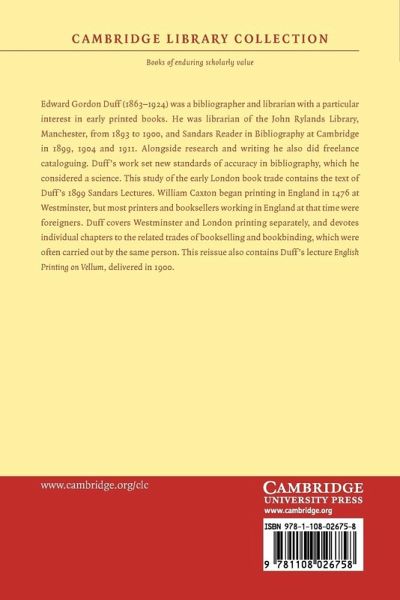 Edward Gordon Duff (1863â 1924) was a librarian and bibliographer with a particular interest in the early history of the printed book. This 1899 work examines the fifteenth-century book trade in London â its printers, booksellers and bookbinders â and shows how much it depended on European book importers and craftsmen.