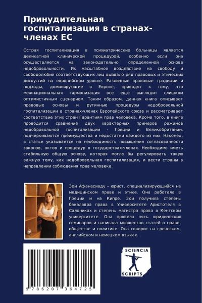 Ostraq gospitalizaciq w psihiatricheskie bol'nicy qwlqetsq delikatnoj klinicheskoj proceduroj, osobenno esli ona osuschestwlqetsq na zakonodatel'no opredelennoj osnowe nedobrowol'nosti. Ih masshtabnoe wozdejstwie na swobodu i swobodolübie sootwetstwuüschih lic wyzwalo rqd prawowyh i äticheskih diskussij na ewropejskom urowne. Razlichnye prawowye tradicii i podhody, dominiruüschie w Ewrope, priwodqt k tomu, chto mezhnacional'naq garmonizaciq wse esche wyglqdit slishkom optimistichnym scenariem. Takim obrazom, dannaq kniga opisywaet prawowye osnowy i rutinnye procedury nedobrowol'noj gospitalizacii w stranah-chlenah Ewropejskogo soüza i rassmatriwaet sootwetstwie ätih stran Garantiqm praw cheloweka. Krome togo, w knige prowoditsq srawnenie dwuh harakternyh primerow rezhimow nedobrowol'noj gospitalizacii - Grecii i Velikobritanii, podcherkiwaütsq preimuschestwa i nedostatki kazhdogo iz nih. Nakonec, w stat'e ukazywaetsq na neobhodimost' powysheniq soglasowannosti zakonow, aktow i procedur w gosudarstwah-chlenah. Neobhodimo imet' stabil'nuü obschuü osnowu, kotoraq mogla by regulirowat' takuü wazhnuü temu, kak nedobrowol'naq gospitalizaciq, i westi strany w naprawlenii soblüdeniq praw cheloweka.