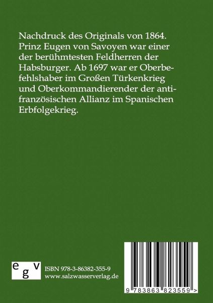 Nachdruck des Originals von 1864. Prinz Eugen von Savoyen war einer der berühmtesten Feldherren der Habsburger. Ab 1697 war er Oberbefehlshaber im Großen Türkenkrieg und Oberkommandierender der antifranzösischen Allianz im Spanischen Erbfolgekrieg.