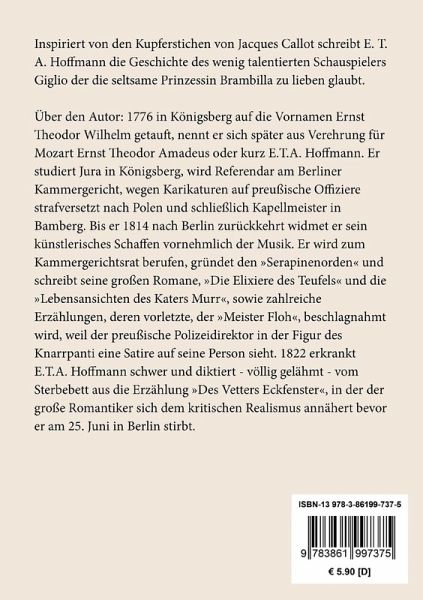 Inspiriert von den Kupferstichen von Jacques Callot schreibt E. T. A. Hoffmann die Geschichte des wenig talentierten Schauspielers Giglio der die seltsame Prinzessin Brambilla zu lieben glaubt.