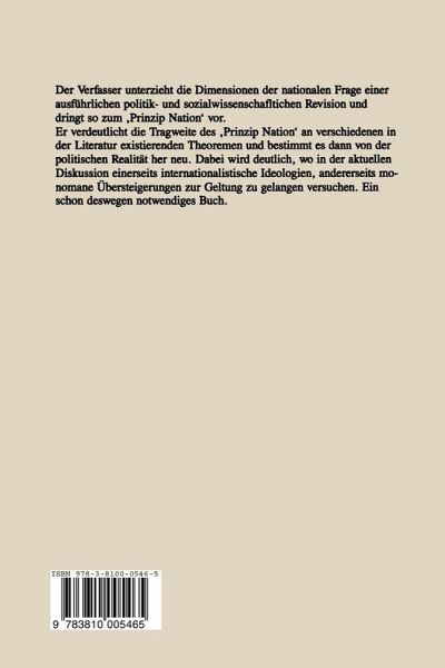I. Einführung.- 1. Theoretisch-methodische Vorbemerkungen.- 2. Zur Definition, Typologie und Soziologie der Nation.- 3. Die Entstehung der Deutschen Nation.- 4. Herausforderungen der deutschlandpolitischen Lage.- II. Darstellung des Prinzips Nation: Grundlagen und Dimensionen der nationalen Frage.- 1. Grundlagen: Praktische Philosophie und Nation.- 2. Dimensionen der nationalen Frage.- 3. Nation als Subjekt der Geschichte.- III. Darstellung des Prinzips Nation: Ordnungsmodell und Wirklichkeitscharakter der Nation.- 1. Ethnizität.- 2. Differenzierte Nation: Ethnos und Demos.- 3.A Die pluralistische Nation.- 3.B. Überholter oder modemer Nationalstaat?.- 4. Nationale Identität, Teilung und Nationalbewußtsein.- 5. Nationaler Wandel.- 6. Weltgesellschaft oder nationales Pluriversum?.- 7. Konkurrenzlage der Nationen.- IV. Resümee: Thesen zum Prinzip Nation.- Personenregister.