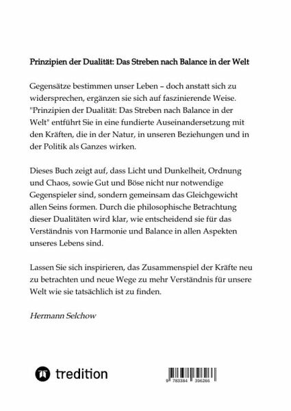 "Prinzipien der Dualität: Das Streben nach Balance in der Welt"Entdecken Sie mit mir die Zusammenhänge der Dualität, die unser Leben und die Welt, in der wir leben, prägen. In "Prinzipien der Dualität: Das Streben nach Balance in der Welt" beleuchtet der Autor die ewigen Gegensätze, die scheinbar im Widerspruch zueinanderstehen, aber in Wahrheit gemeinsam das Gleichgewicht in allen Dingen anstreben.Dieses Buch bietet eine philosophische Betrachtung über das universelle Prinzip der Dualität. Es erklärt, wie gegensätzliche Kräfte wie Licht und Dunkelheit, Ordnung und Chaos, Gut und Böse, Liebe und Angst nicht nur miteinander in Konflikt stehen, sondern auch voneinander abhängig sind, um Harmonie und Balance zu erreichen.Ob in der Natur, den menschlichen Beziehungen oder in der Weltpolitik - das Zusammenspiel dieser Kräfte ist unerlässlich für das Verständnis und die Existenz der Welt. "Prinzipien der Dualität" ermutigt Sie, das Streben nach Balance in allen Bereichen des Lebens zu überdenken und neue Perspektiven auf die Herausforderungen des Alltags zu gewinnen.Was Sie erwartet:Weitgehende Einblicke in die Gegensätzlichkeiten, die unsere Welt formenPhilosophische Reflexionen über das Zusammenspiel von Kräften und deren Bedeutung für unser aller LebenPraktische Überlegungen und Inspirationen für mehr Harmonie und AusgeglichenheitDieses Buch richtet sich an alle, die die Welt durch eine neue, tiefere Linse betrachten möchten - egal ob Sie sich für Philosophie, Persönlichkeitsentwicklung oder die Realitäten des Weltgeschehens interessieren.Tauchen Sie ein in die faszinierenden Prinzipien der Dualität und begeben Sie sich auf eine Reise durch das Universum der Balance und Widersprüche.