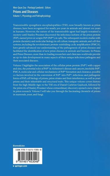Transmissible Spongiform Encephalopathy: from the High Middle Ages to Daniel Carlton Gajdusek.- The Rich Chemistry of the Copper and Zinc Sites in Cellular Prion Protein.- Role of Cellular Prion Protein in the Amyloid-ß Oligomer Pathophysiology of Alzheimer's Disease.- Cellular Prion Protein and Cancers.- Insoluble Cellular Prion Protein.- Protein Misfolding Cyclic Amplification.- Cofactor Involvement in Prion Propagation.- Prion Protein Conversion and Lipids.- New Perspectives on Prion Conversion: Introducing a Mechanism of Deformed Templating.- Infectious and Pathogenic Forms of Prion Protein.- Cellular Mechanisms of Propagation and Clearance.- Molecular Mechanisms Encoding Quantitative and Qualitative Traits of Prion Strains.- Modeling the Cell Biology of Prions.- Prion Strain Interference.- Introduction to Yeast and Fungal Prions.- Yeast Prions are Pathogenic, in-register Parallel Amyloids.