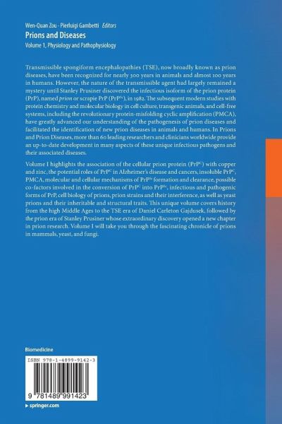 Transmissible Spongiform Encephalopathy: from the High Middle Ages to Daniel Carlton Gajdusek.- The Rich Chemistry of the Copper and Zinc Sites in Cellular Prion Protein.- Role of Cellular Prion Protein in the Amyloid-ß Oligomer Pathophysiology of Alzheimer's Disease.- Cellular Prion Protein and Cancers.- Insoluble Cellular Prion Protein.- Protein Misfolding Cyclic Amplification.- Cofactor Involvement in Prion Propagation.- Prion Protein Conversion and Lipids.- New Perspectives on Prion Conversion: Introducing a Mechanism of Deformed Templating.- Infectious and Pathogenic Forms of Prion Protein.- Cellular Mechanisms of Propagation and Clearance.- Molecular Mechanisms Encoding Quantitative and Qualitative Traits of Prion Strains.- Modeling the Cell Biology of Prions.- Prion Strain Interference.- Introduction to Yeast and Fungal Prions.- Yeast Prions are Pathogenic, in-register Parallel Amyloids.
