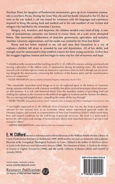 Penelope Prior, the daughter of Presbyterian missionaries, grew up in an Armenian community in northern Persia. During the Great War, she and her family returned to the US. But as soon as the war ended, a call was issued for volunteers with the languages and experience required to bring life-saving food and medical aid to the vast numbers of war victims and refugees who had fled to the Armenian Caucasus. Hungry, sick, homeless, and desperate, the children needed every kind of help. A new type of humanitarian enterprise was formed to rescue them, on a scale never attempted before. This innovative collaboration of churches, government, agriculture and industry, charities, voluntary organizations, and the media was created by the Near East Relief. Penny and her father respond to the call and soon find themselves in a city of orphans--children left alone or stranded by war and deportation. All of her ability and strength must be summoned to help establish a haven for these young survivors. As they face the struggles together, trauma and loss begin to make way for a bit of recovery and hope.