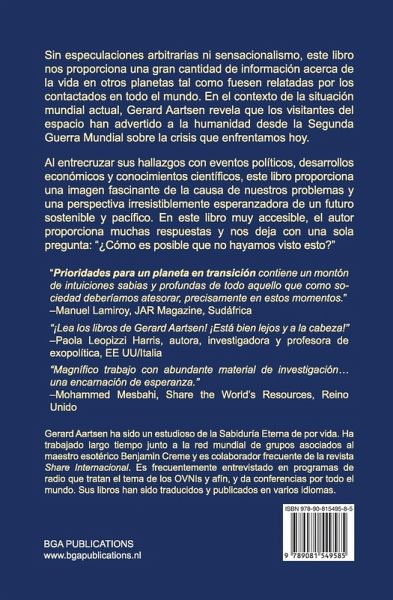 Sin especulaciones arbitrarias ni sensacionalismo, este libro nos proporciona una gran cantidad de información acerca de la vida en otros planetas tal como fuesen relatadas por los contactados en todo el mundo. En el contexto de la situación mundial actual, Gerard Aartsen revela que los visitantes del espacio han advertido a la humanidad desde la Segunda Guerra Mundial sobre la crisis que enfrentamos hoy. Al entrecruzar sus hallazgos con eventos políticos, desarrollos económicos y conocimientos científicos, este libro proporciona una imagen fascinante de la causa de nuestros problemas y una perspectiva irresistiblemente esperanzadora de un futuro sostenible y pacífico. En este libro muy accesible, el autor proporciona muchas respuestas y nos deja con una sola pregunta: "¿Cómo es posible que no hayamos visto esto?"