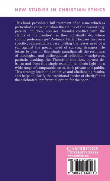 This book provides a full treatment of an issue which is particularly pressing: when the claims of the nearest (e.g. parents, children, spouses, friends) conflict with the claims of the neediest, as they constantly do, where should preference go? Professor Hallett focuses first on a specific, representative case, pitting the lesser need of a son against the greater need of starving strangers. He brings to bear on this single paradigm all the resources of theological and philosophical reflection - scriptures, patristic teaching, the Thomistic tradition, current debates - and from this single example he sheds light on a wide range of comparable cases, both private and public. This distinctive strategy leads to distinctive and challenging results, and at the same time helps to clarify the traditional 'order of charity' and the celebrated 'preferential option for the poor'.