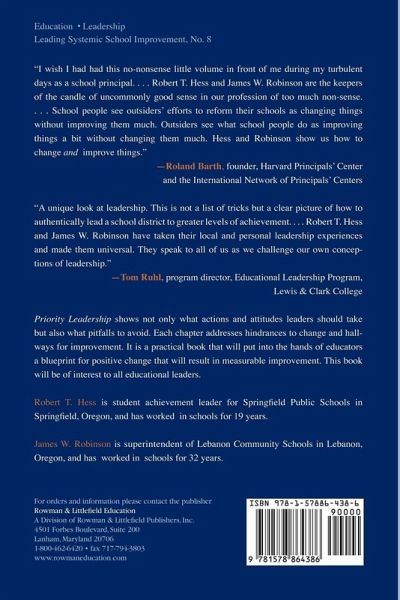 Priority Leadership shows not only what actions and attitudes leaders should take, but also what pitfalls to avoid. Each chapter addresses hindrances to change and hallways for improvement. It is a practical book that will put into the hands of educators a blueprint for positive change that will lead to measurable improvement. This book will be of interest to all educational leaders.