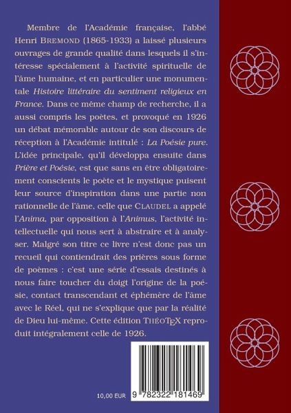 Membre de l'Académie française, l'abbé Henri Bremond (1865-1933) a laissé plusieurs ouvrages de grande qualité dans lesquels il s'intéresse spécialement à l'activité spirituelle de l'âme humaine, et en particulier une monumentale Histoire littéraire du sentiment religieux en France. Dans ce même champ de recherche, il a aussi compris les poètes, et provoqué en 1926 un débat mémorable autour de son discours de réception à l'Académie intitulé : La Poésie pure. L'idée principale, qu'il développa ensuite dans Prière et Poésie, est que sans en être obligatoirement conscients le poète et le mystique puisent leur source d'inspiration dans une partie non rationnelle de l'âme, celle que Claudel a appelé l'Anima, par opposition à l'Animus, l'activité intellectuelle qui nous sert à abstraire et à analyser. Malgré son titre ce livre n'est donc pas un recueil qui contiendrait des prières sous forme de poèmes : c'est une série d'essais destinés à nous faire toucher du doigt l'origine de la poésie, contact transcendant et éphémère de l'âme avec le Réel, qui ne s'explique que par la réalité de Dieu lui-même. Cette édition ThéoTeX reproduit intégralement celle de 1926.