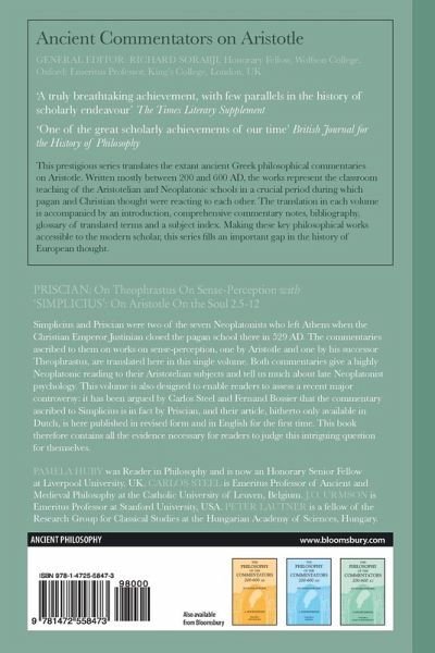 Simplicius and Priscian were two of the seven Neoplatonists who left Athens when the Christian Emperor Justinian closed the paganschool there in A.D. 529. The commentaries ascribed to them on works on sense-perception, one by Aristotle and one by his successor Theophrastus, are translated here in this single volume. Both commentaries give a highly Neoplatonic reading to their Aristotelian subjects and tell us much about late Neoplatonist psychology. This volume is also designed to enable readers to assess a recent major controversy: it has been argued by Carlos Steel and Fernand Bossier that the commentary ascribed to Simplicius is in fact by Priscian, and their article, hitherto only available in Dutch, is here published in revised form and in English for the first time. This book therefore contains all the evidence necessary for readers to judge this intriguing question for themselves.
