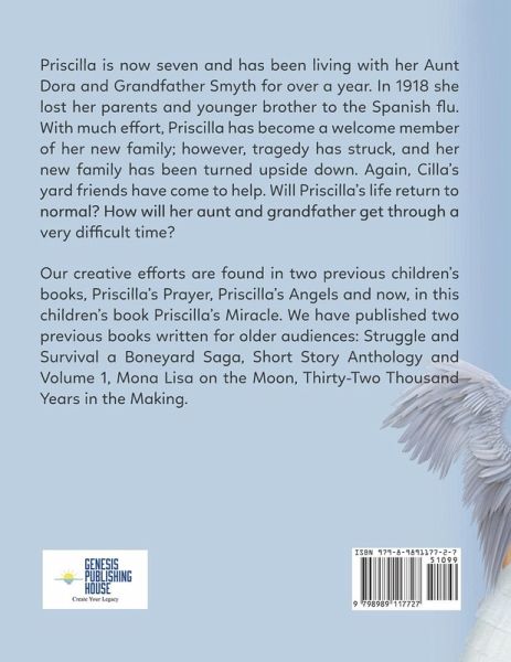 Priscilla is now seven and has been living with her Aunt Dora and Grandfather Smyth for over a year. In 1918 she lost her parents and younger brother to the Spanish flu. With much effort, Priscilla has become a welcome member of her new family; however, tragedy has struck, and her new family has been turned upside down. Again, Cilla's yard friends have come to help. Will Priscilla's life return to normal? How will her aunt and grandfather get through a very difficult time? Our creative efforts are found in two previous children's books, Priscilla's Prayer, Priscilla's Angels and now, in this children's book Priscilla's Miracle. We have published two previous books written for older audiences: Struggle and Survival a Boneyard Saga, Short Story Anthology and Volume 1, Mona Lisa on the Moon, Thirty-Two Thousand Years in the Making.
