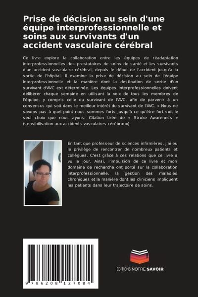 Ce livre explore la collaboration entre les équipes de réadaptation interprofessionnelles des prestataires de soins de santé et les survivants d'un accident vasculaire cérébral, depuis le début de l'accident jusqu'à la sortie de l'hôpital. Il examine la prise de décision au sein de l'équipe interprofessionnelle et la manière dont la destination de sortie d'un survivant d'AVC est déterminée. Les équipes interprofessionnelles doivent délibérer chaque semaine en utilisant la voix de tous les membres de l'équipe, y compris celle du survivant de l'AVC, afin de parvenir à un consensus qui soit dans le meilleur intérêt du survivant de l'AVC. « Nous ne savons pas à quel point nous sommes forts jusqu'à ce qu'être fort soit le seul choix que nous ayons. Citation tirée de « Stroke Awareness » (sensibilisation aux accidents vasculaires cérébraux).