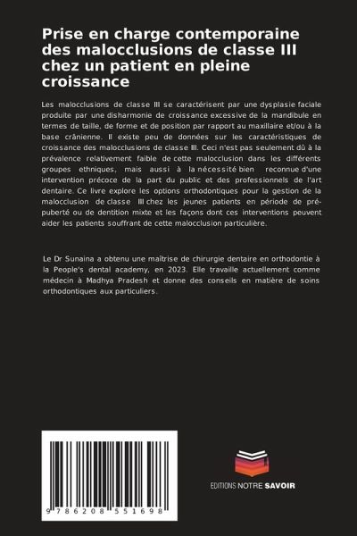 Les malocclusions de classe III se caractérisent par une dysplasie faciale produite par une disharmonie de croissance excessive de la mandibule en termes de taille, de forme et de position par rapport au maxillaire et/ou à la base crânienne. Il existe peu de données sur les caractéristiques de croissance des malocclusions de classe III. Ceci n'est pas seulement dû à la prévalence relativement faible de cette malocclusion dans les différents groupes ethniques, mais aussi à la nécessité bien reconnue d'une intervention précoce de la part du public et des professionnels de l'art dentaire. Ce livre explore les options orthodontiques pour la gestion de la malocclusion de classe III chez les jeunes patients en période de pré-puberté ou de dentition mixte et les façons dont ces interventions peuvent aider les patients souffrant de cette malocclusion particulière.