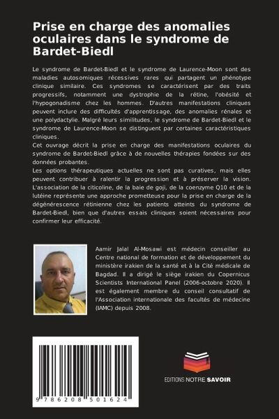 Le syndrome de Bardet-Biedl et le syndrome de Laurence-Moon sont des maladies autosomiques récessives rares qui partagent un phénotype clinique similaire. Ces syndromes se caractérisent par des traits progressifs, notamment une dystrophie de la rétine, l'obésité et l'hypogonadisme chez les hommes. D'autres manifestations cliniques peuvent inclure des difficultés d'apprentissage, des anomalies rénales et une polydactylie. Malgré leurs similitudes, le syndrome de Bardet-Biedl et le syndrome de Laurence-Moon se distinguent par certaines caractéristiques cliniques. Cet ouvrage décrit la prise en charge des manifestations oculaires du syndrome de Bardet-Biedl grâce à de nouvelles thérapies fondées sur des données probantes.Les options thérapeutiques actuelles ne sont pas curatives, mais elles peuvent contribuer à ralentir la progression et à préserver la vision. L'association de la citicoline, de la baie de goji, de la coenzyme Q10 et de la lutéine représente une approche prometteuse pour la prise en charge de la dégénérescence rétinienne chez les patients atteints du syndrome de Bardet-Biedl, bien que d'autres essais cliniques soient nécessaires pour confirmer leur efficacité.
