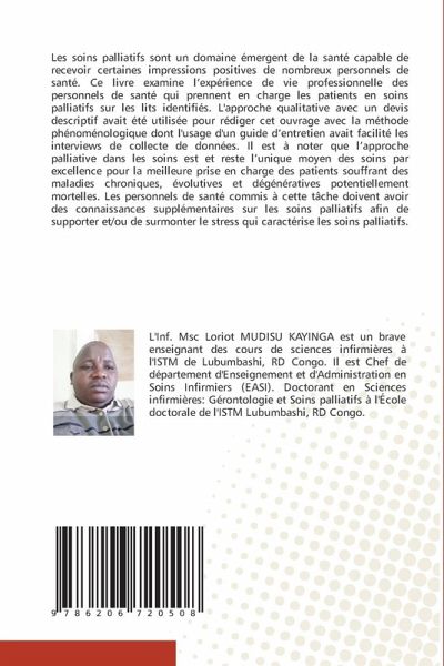 Les soins palliatifs sont un domaine émergent de la santé capable de recevoir certaines impressions positives de nombreux personnels de santé. Ce livre examine l'expérience de vie professionnelle des personnels de santé qui prennent en charge les patients en soins palliatifs sur les lits identifiés. L'approche qualitative avec un devis descriptif avait été utilisée pour rédiger cet ouvrage avec la méthode phénoménologique dont l'usage d'un guide d'entretien avait facilité les interviews de collecte de données. Il est à noter que l'approche palliative dans les soins est et reste l'unique moyen des soins par excellence pour la meilleure prise en charge des patients souffrant des maladies chroniques, évolutives et dégénératives potentiellement mortelles. Les personnels de santé commis à cette tâche doivent avoir des connaissances supplémentaires sur les soins palliatifs afin de supporter et/ou de surmonter le stress qui caractérise les soins palliatifs.
