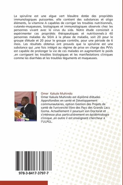 La spiruline est une algue vert bleuâtre dotée des propriétés immunologiques puissantes. elle contient des substances et oligo éléments, la vitamine A capables de corriger les troubles nutritionnels, cutanéo-muqueuses, biologiques et immunologiques observés chez les personnes vivant avec le virus du sida. Notre étude consistait à expérimenter ces propriétés thérapeutiques et nutritionnels à 40 personnes malades du SIDA à la phase de maladie, soit 20 pour le groupe d'étude et 20 pour le groupe contrôle, pour une période de 6 mois. Les résultats obtenus ont prouvés que la spiruline est une substance qui ,une fois intégré au régime de prise en charge des PVVs est capable de prolonger la vie de ces malades en augmentant le poids ,en corrigeant les troubles biologiques et les manifestations cliniques comme les diarrhées et les troubles téguments et muqueuses.