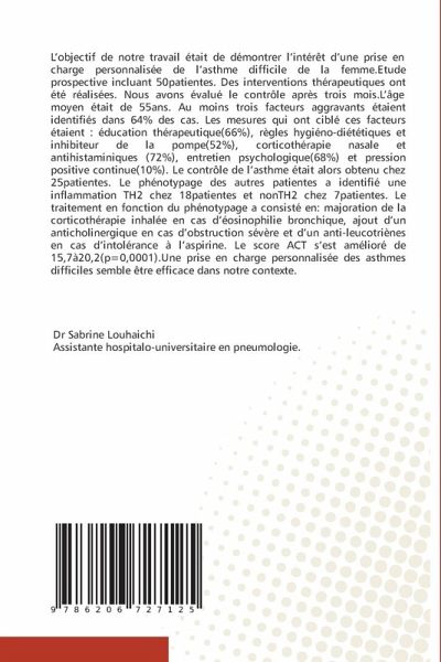 L'objectif de notre travail était de démontrer l'intérêt d'une prise en charge personnalisée de l'asthme difficile de la femme.Etude prospective incluant 50patientes. Des interventions thérapeutiques ont été réalisées. Nous avons évalué le contrôle après trois mois.L'âge moyen était de 55ans. Au moins trois facteurs aggravants étaient identifiés dans 64% des cas. Les mesures qui ont ciblé ces facteurs étaient : éducation thérapeutique(66%), règles hygiéno-diététiques et inhibiteur de la pompe(52%), corticothérapie nasale et antihistaminiques (72%), entretien psychologique(68%) et pression positive continue(10%). Le contrôle de l'asthme était alors obtenu chez 25patientes. Le phénotypage des autres patientes a identifié une inflammation TH2 chez 18patientes et nonTH2 chez 7patientes. Le traitement en fonction du phénotypage a consisté en: majoration de la corticothérapie inhalée en cas d'éosinophilie bronchique, ajout d'un anticholinergique en cas d'obstruction sévère et d'un anti-leucotriènes en cas d'intolérance à l'aspirine. Le score ACT s'est amélioré de 15,7à20,2(p=0,0001).Une prise en charge personnalisée des asthmes difficiles semble être efficace dans notre contexte.