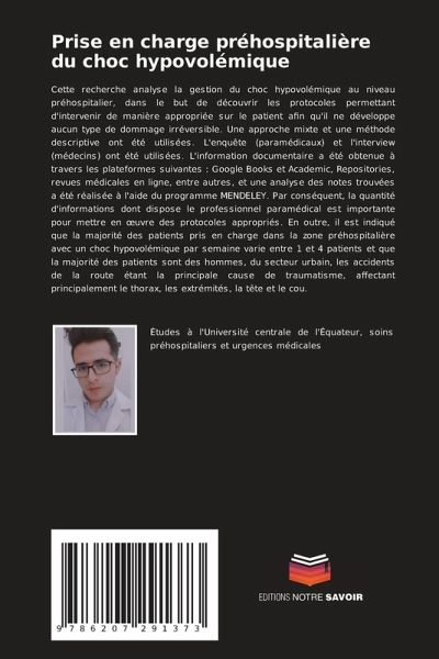 Cette recherche analyse la gestion du choc hypovolémique au niveau préhospitalier, dans le but de découvrir les protocoles permettant d'intervenir de manière appropriée sur le patient afin qu'il ne développe aucun type de dommage irréversible. Une approche mixte et une méthode descriptive ont été utilisées. L'enquête (paramédicaux) et l'interview (médecins) ont été utilisées. L'information documentaire a été obtenue à travers les plateformes suivantes : Google Books et Academic, Repositories, revues médicales en ligne, entre autres, et une analyse des notes trouvées a été réalisée à l'aide du programme MENDELEY. Par conséquent, la quantité d'informations dont dispose le professionnel paramédical est importante pour mettre en oeuvre des protocoles appropriés. En outre, il est indiqué que la majorité des patients pris en charge dans la zone préhospitalière avec un choc hypovolémique par semaine varie entre 1 et 4 patients et que la majorité des patients sont des hommes, du secteur urbain, les accidents de la route étant la principale cause de traumatisme, affectant principalement le thorax, les extrémités, la tête et le cou.