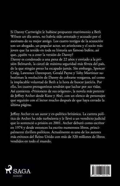Si Danny Cartwright le hubiese propuesto matrimonio a Beth Wilson un día antes, no habría sido arrestado y acusado por el asesinato de su mejor amigo. Los cuatro testigos de la acusación son un abogado, un popular actor, un aristócrata y el socio más joven que ha tenido en toda su historia un famoso bufete, así que, ¿quién va a creer la versión de Danny? Danny es condenado a una pena de 22 años y enviado a la prisión Belmarsh, la cárcel de máxima seguridad más férrea del país, de la que ningún preso ha escapado jamás. Sin embargo, Spencer Craig, Lawrence Davenport, Gerald Payne y Toby Mortimer subestiman la resolución de Danny de cobrarse venganza, así como la implacable voluntad de Beth a la hora de buscar justicia. Por ello, los cuatro protagonistas tendrán que luchar por sus vidas. Así comienza «Prisionero de sus orígenes», la novela más potente de Jeffrey Archer desde Kane y Abel, con un elenco de personajes que seguirán con el lector mucho después de que haya cerrado la última página. -
