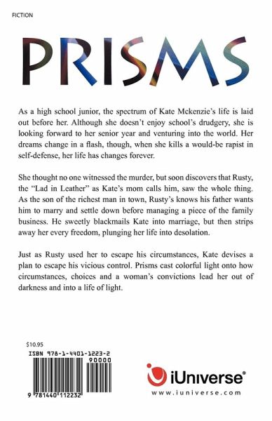 As a high school junior, the spectrum of Kate Mckenzie's life is laid out before her. Although she doesn't enjoy school's drudgery, she is looking forward to her senior year and venturing into the world. Her dreams change in a flash, though, when she kills a would-be rapist in self-defense, her life has changes forever. She thought no one witnessed the murder, but soon discovers that Rusty, the "Lad in Leather" as Kate's mom calls him, saw the whole thing. As the son of the richest man in town, Rusty's knows his father wants him to marry and settle down before managing a piece of the family business. He sweetly blackmails Kate into marriage, but then strips away her every freedom, plunging her life into desolation. Just as Rusty used her to escape his circumstances, Kate devises a plan to escape his vicious control. Prisms cast colorful light onto how circumstances, choices and a woman's convictions lead her out of darkness and into a life of light.