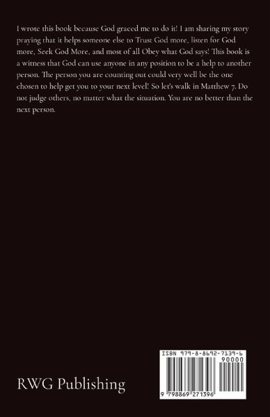 I wrote this book because God graced me to do it! I am sharing my story praying that it helps someone else to Trust God more, listen for God more, Seek God More, and most of all Obey what God says! This book is a witness that God can use anyone in any position to be a help to another person. The person you are counting out could very well be the one chosen to help get you to your next level! So let's walk in Matthew 7. Do not judge others, no matter what the situation. You are no better than the next person.