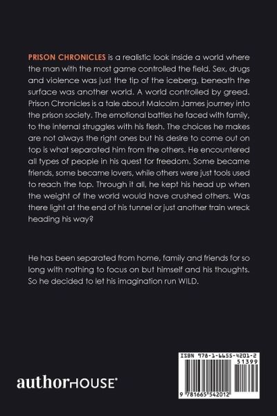 Prison Chronicles is a realistic look inside a world where the man with the most game controlled the field. Sex, drugs and violence was just the tip of the iceberg, beneath the surface was another world. A world controlled by greed. Prison Chronicles is a tale about Malcolm James journey into the prison society. The emotional battles he faced with family, to the internal struggles with his flesh. The choices he makes are not always the right ones but his desire to come out on top is what separated him from the others. He encountered all types of people in his quest for freedom. Some became friends, some became lovers, while others were just tools used to reach the top. Through it all, he kept his head up when the weight of the world would have crushed others. Was there light at the end of his tunnel or just another train wreck heading his way?