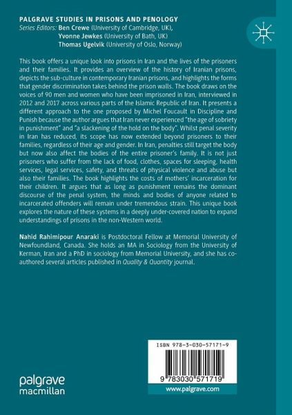 This book offers a unique look into prisons in Iran and the lives of the prisoners and their families. It provides an overview of the history of Iranian prisons, depicts the sub-culture in contemporary Iranian prisons, and highlights the forms that gender discrimination takes behind the prison walls. The book draws on the voices of 90 men and women who have been imprisoned in Iran, interviewed in 2012 and 2017 across various parts of the Islamic Republic of Iran. It presents a different approach to the one proposed by Michel Foucault in Discipline and Punish because the author argues that Iran never experienced "the age of sobriety in punishment" and "a slackening of the hold on the body". Whilst penal severity in Iran has reduced, its scope has now extended beyond prisoners to their families, regardless of their age and gender. In Iran, penalties still target the body but now also affect the bodies of the entire prisoner's family. It is not just prisoners who suffer from the lack of food, clothes, spaces for sleeping, health services, legal services, safety, and threats of physical violence and abuse but also their families. The book highlights the costs of mothers' incarceration for their children. It argues that as long as punishment remains the dominant discourse of the penal system, the minds and bodies of anyone related to incarcerated offenders will remain under tremendous strain. This unique book explores the nature of these systems in a deeply under-covered nation to expand understandings of prisons in the non-Western world.