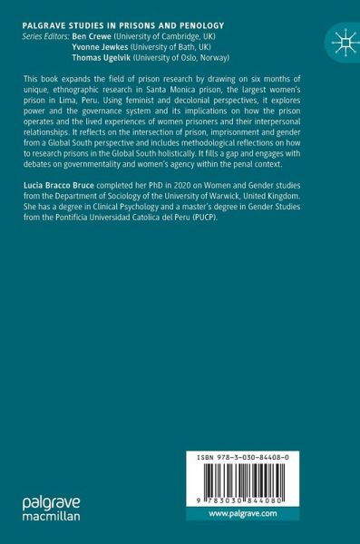 This book expands the field of prison research by drawing on six months of unique, ethnographic research in Santa Monica prison, the largest women's prison in Lima, Peru. Using feminist and decolonial perspectives, it explores power and the governance system and its implications on how the prison operates and the lived experiences of women prisoners and their interpersonal relationships. It reflects on the intersection of prison, imprisonment and gender from a Global South perspective and includes methodological reflections on how to research prisons in the Global South holistically. It fills a gap and engages with debates on governmentality and women's agency within the penal context.