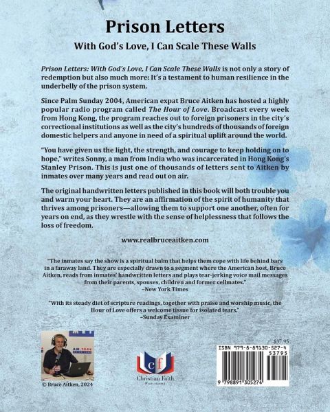 Prison Letters: With God's Love, I Can Scale These Walls is not only a story of redemption but also much more: It's a testament to human resilience in the underbelly of the prison system. Since Palm Sunday 2004, American expat Bruce Aitken has hosted a highly popular radio program called The Hour of Love. Broadcast every week from Hong Kong, the program reaches out to foreign prisoners in the city's correctional institutions as well as the city's hundreds of thousands of foreign domestic helpers and anyone in need of a spiritual uplift around the world. "You have given us the light, the strength, and courage to keep holding on to hope," writes Sonny, a man from India who was incarcerated in Hong Kong's Stanley Prison. This is just one of thousands of letters sent to Aitken by inmates over many years and read out on air. The original handwritten letters published in this book will both trouble you and warm your heart. They are an affirmation of the spirit of humanity that thrives among prisoners--allowing them to support one another, often for years on end, as they wrestle with the sense of helplessness that follows the loss of freedom. www.realbruceaitken.com