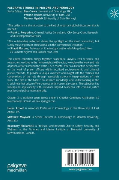 1. Introduction.- PART I: Prison Officer Interpretations and Performances of Power and Authority.- 2. The moral value of authority: Reflections on the work of prison officers.- 3. Ukrainian prison officers and their power.- 4. French prison officers' legal socialization: 'The law, yes; prisoners' rights, no'.- 5. Proxy governance in (post) colonial prisons: When prison officers delegate power to prisoners.- PART II: Prison Officer Identities and Workplace Cultures.- 6. Dirty work and beyond: Representations of Prison Officers in Prison Films.- 7. "It's a very clannish type of job": Entitativity and identity in prison officers' occupational cultures and identities.- 8. 'Friendly but not friends' or 'Never trust the bastards'? Staff-prisoner interaction styles in Australia and Norway. 9. "It is important to be a prison officer and have trade union back up": Exploring trade union membership within the Scottish Prison Service.- 10. The prison officer in post-soviet Russia.- PART III: Implications of Prison Policy and Management for the Role of Prison Officers.- 11. "Prison officers should be treated fairly": Perceptions and experiences of fairness among prison officers in Ghana.- 12. Do risk-reducing measures only reduce risk? Prison officer work with risk-reducing measures in the imprisonment of a high-risk prisoner.- 13. Farewell to exceptionalism: An analysis of Swedish prisons officers' attitudes towards prison policy, organisation, and their occupational role in 2009 and 2019.- 14. The role of prison officers in transforming prisoners' lives in Hong Kong.- 15. Locating Prison Officers in the prison reforms discourse: Insights from India.- PART IV: Working Conditions and Prison Officer Well-Being.- 16. The well-being of correctional officers in Canada.- 17. Fear and perceived risk among correctional officers.- 18. Prison Officers and their Work Routine in Brazilian Prisons.- 19. Conclusion: Towards a new research agenda to analyse the contemporary prison officer role.