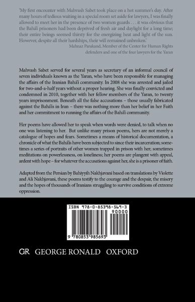 Mahvash Sabet has been named as the PEN Pinter International Writer of Courage 2017. 'My first encounter with Mahvash Sabet took place on a hot summer's day. After many hours of tedious waiting in a special room set aside for lawyers, I was finally allowed to meet her in the presence of two women guards . . . it was obvious that the Bahá'í prisoners had been deprived of fresh air and daylight for a long time; their entire beings seemed thirsty for the energizing heat and light of the sun. However, despite all their hardships, their will remained unbroken.' Mahnaz Parakand, Member of the Center for Human Rights defenders and one of the four lawyers for the Yaran Mahvash Sabet served for several years as secretary of an informal council of seven individuals known as the Yaran, who have been responsible for managing the affairs of the Iranian Bahá'í community. In 2008 she was arrested and jailed for two-and-a-half years without a proper hearing. She was finally convicted and condemned in 2010, together with her fellow members of the Yaran, to twenty years imprisonment. Beneath all the false accusations - those usually fabricated against the Bahá'ís in Iran - there was nothing more than her belief in her Faith and her commitment to running the affairs of the Bahá'í community. Her poems have allowed her to speak when words were denied, to talk when no one was listening to her. But unlike many prison poems, hers are not merely a catalogue of hopes and fears. Sometimes a means of historical documentation, a chronicle of what the Bahá'ís have been subjected to since their incarceration; sometimes a series of portraits of other women trapped in prison with her; sometimes meditations on powerlessness, on loneliness; her poems are plangent with appeal, ardent with hope - for whatever the accusations against her, she is a prisoner of faith. Adapted from the Persian by Bahiyyih Nakhjavani based on translations by Violette and Ali Nakhjavani, these poems testify to the courage and the despair, the misery and the hopes of thousands of Iranians struggling to survive conditions of extreme oppression.