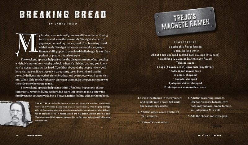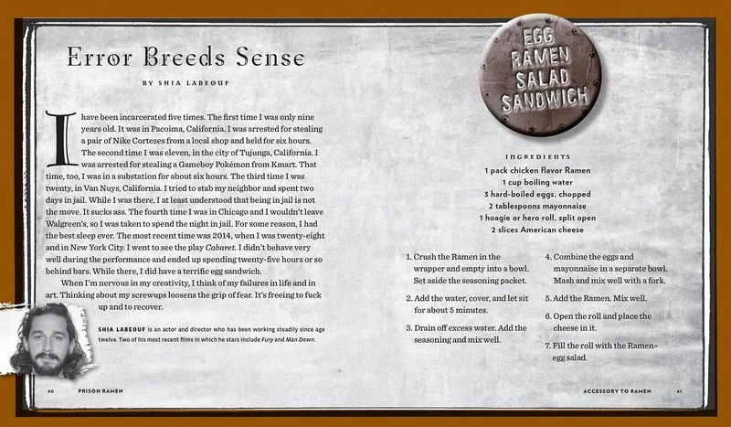 Prison Ramen takes readers behind bars, with 65 ramen recipes combined with stories of prison life from the inmates who devised them, including celebrities like Slash from Guns n' Roses and the actor Shia LaBeouf. Forget the typical recipe headnote about precious, organic ingredients - these stories are the real deal.