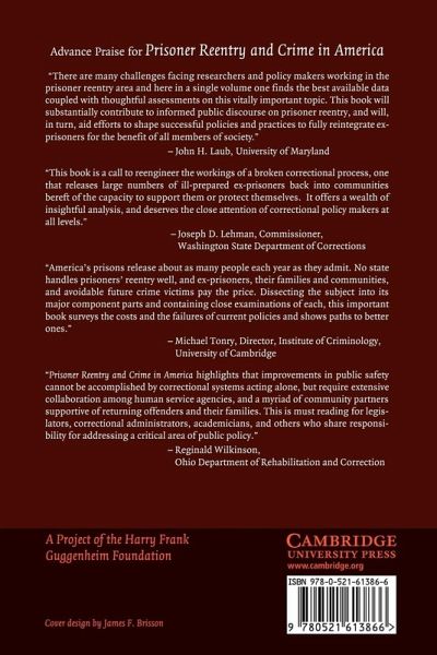 Prisoner Reentry and Crime in America is intended to shed light on a question that fuels the public's concern about the number of returning prisoners. What are the public safety consequences of the fourfold increase in the number of individuals entering and leaving the nation's prisons each year(?)33; Many have speculated about the nexus between prisoner reentry and public safety. Journalistic accounts of the reentry phenomenon have painted a picture of a tidal wave of hardened criminals coming back home to resume their destructive lifestyles. Law enforcement officials have attributed increases in violence in their communities to the influx of returning prisoners. Politicians have recommended policies that keep former prisoners out of high crime neighborhoods in the belief that crime would be reduced. The chapters in this book address these issues and suggest policies that will keep released prisoners from committing new crimes.