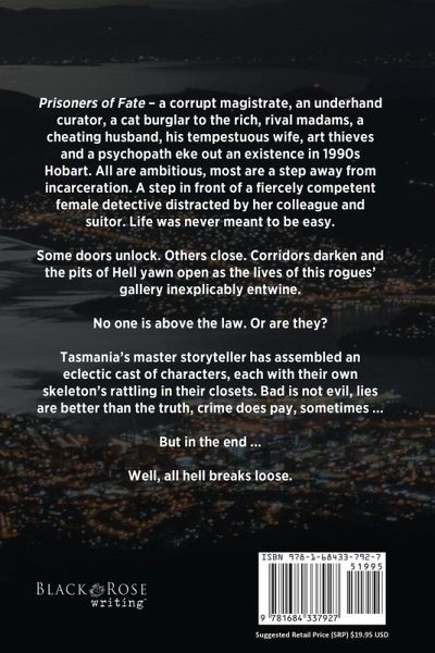 Prisoners of Fate - a corrupt magistrate, an underhand curator, a cat burglar to the rich, rival madams, a cheating husband, his tempestuous wife, art thieves and a psychopath eke out an existence in 1990s Hobart. All are ambitious, most are a step away from incarceration. A step in front of a fiercely competent female detective distracted by her colleague and suitor. Life was never meant to be easy. Some doors unlock. Others close. Corridors darken and the pits of Hell yawn open as the lives of this rogues' gallery inexplicably entwine. No one is above the law. Or are they? Tasmania's master storyteller has assembled an eclectic cast of characters, each with their own skeleton's rattling in their closets. Bad is not evil, lies are better than the truth, crime does pay, sometimes ... But in the end ... Well, all hell breaks loose.