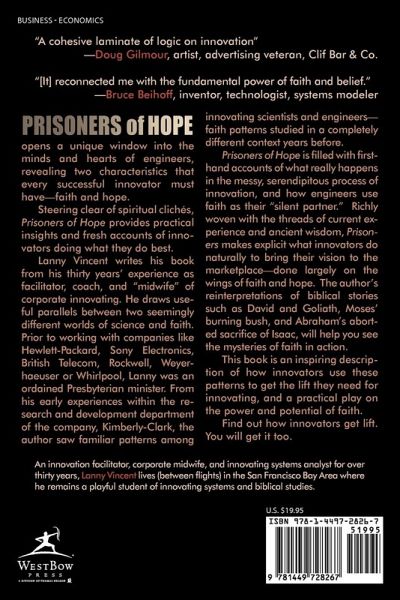 Prisoners of Hope opens a unique window into the minds and hearts of engineers, revealing two characteristics that every successful innovator must have—faith and hope. Steering clear of spiritual clichés, Prisoners of Hope provides practical insights and fresh accounts of innovators doing what they do best. Lanny Vincent writes his book from his thirty years’ experience as facilitator, coach, and "midwife" of corporate innovating. He draws useful parallels between two seemingly different worlds of science and faith. Prior to working with companies like Hewlett-Packard, Sony Electronics, British Telecom, Rockwell, Weyerhaeuser or Whirlpool, Lanny was an ordained Presbyterian minister. From his early experiences within the research and development department of the company, Kimberly-Clark, the author saw familiar patterns among innovating scientists and engineers—faith patterns studied in a completely different context years before. Prisoners of Hope is filled with firsthand accounts of what really happens in the messy, serendipitous process of innovation, and how engineers use faith as their "silent partner." Richly woven with the threads of current experience and ancient wisdom, Prisoners makes explicit what innovators do naturally to bring their vision to the marketplace—done largely on the wings of faith and hope. The author’s reinterpretations of biblical stories such as David and Goliath, Moses’ burning bush, and Abraham’s aborted sacrifice of Isaac, will help you see the mysteries of faith in action. This book is an inspiring description of how innovators use these patterns to get the lift they need for innovating, and a practical play on the power and potential of faith. Find out how innovators get lift. You will get it too. "A cohesive laminate of logic on innovation" – Doug Gilmour, artist, advertising veteran, Clif Bar & Co. "[It] reconnected me with the fundamental power of faith and belief." – Bruce Beihoff, inventor, technologist, systems modeler